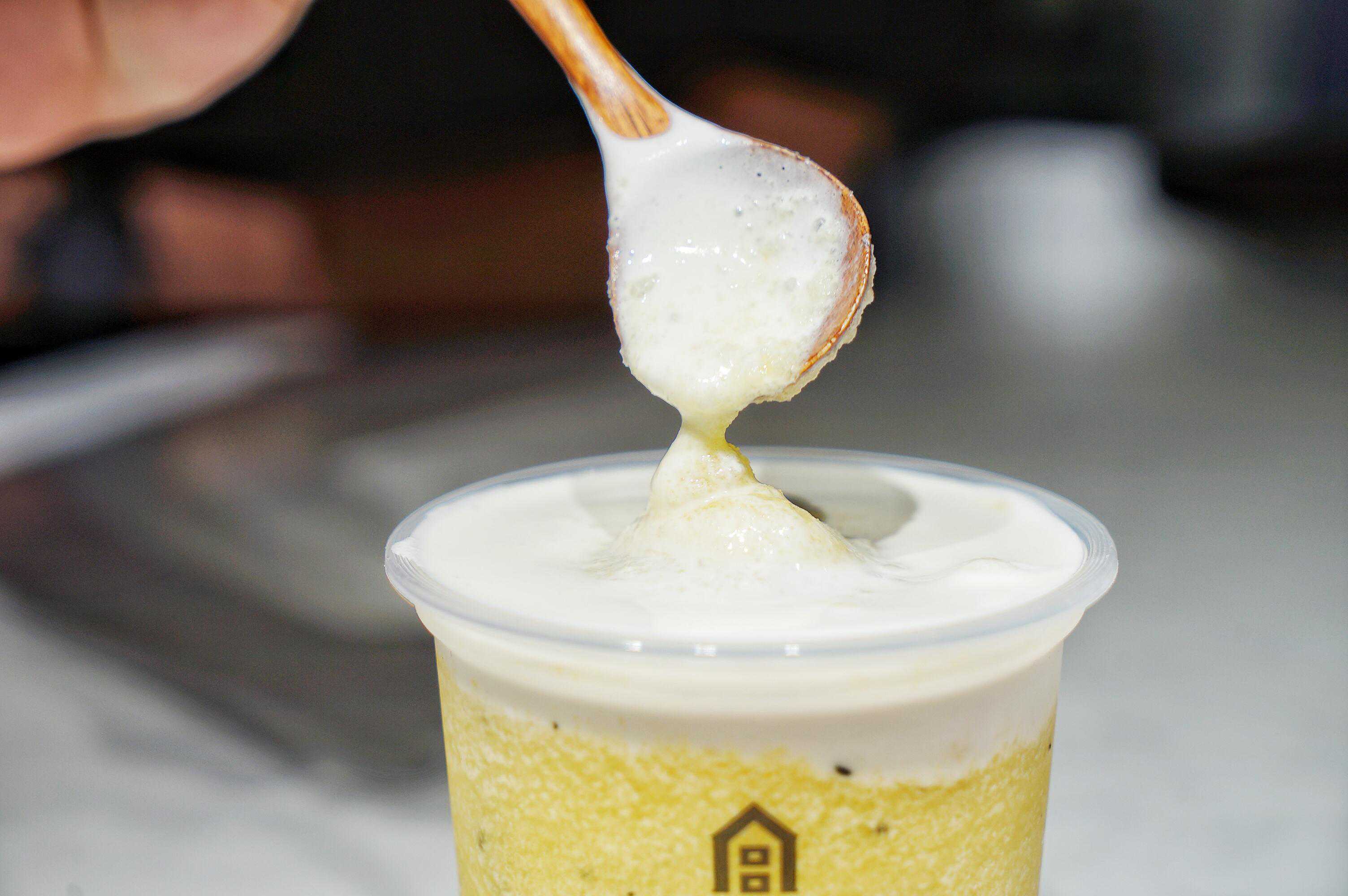 百香果加茶和冰打成绵密的百香果冰沙,用安佳淡奶油和雀巢牛奶做成的咸奶盖覆于其上,喝过的人都会极尽形容词来赞美它。